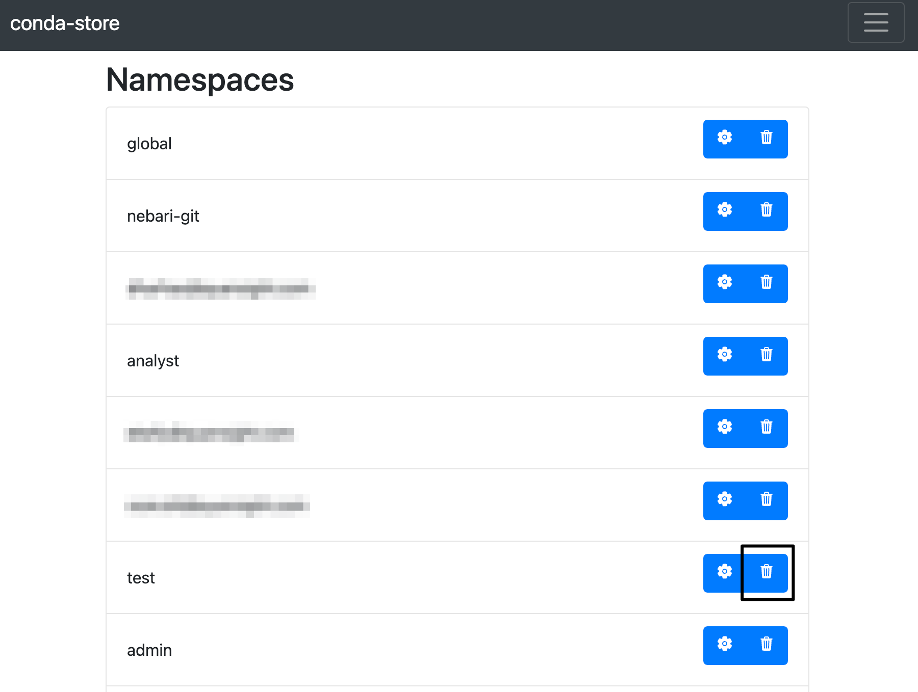 Once all environments are migrated, you will be able to delete the default and filesystem namespaces using the delete option from the conda-store UI: